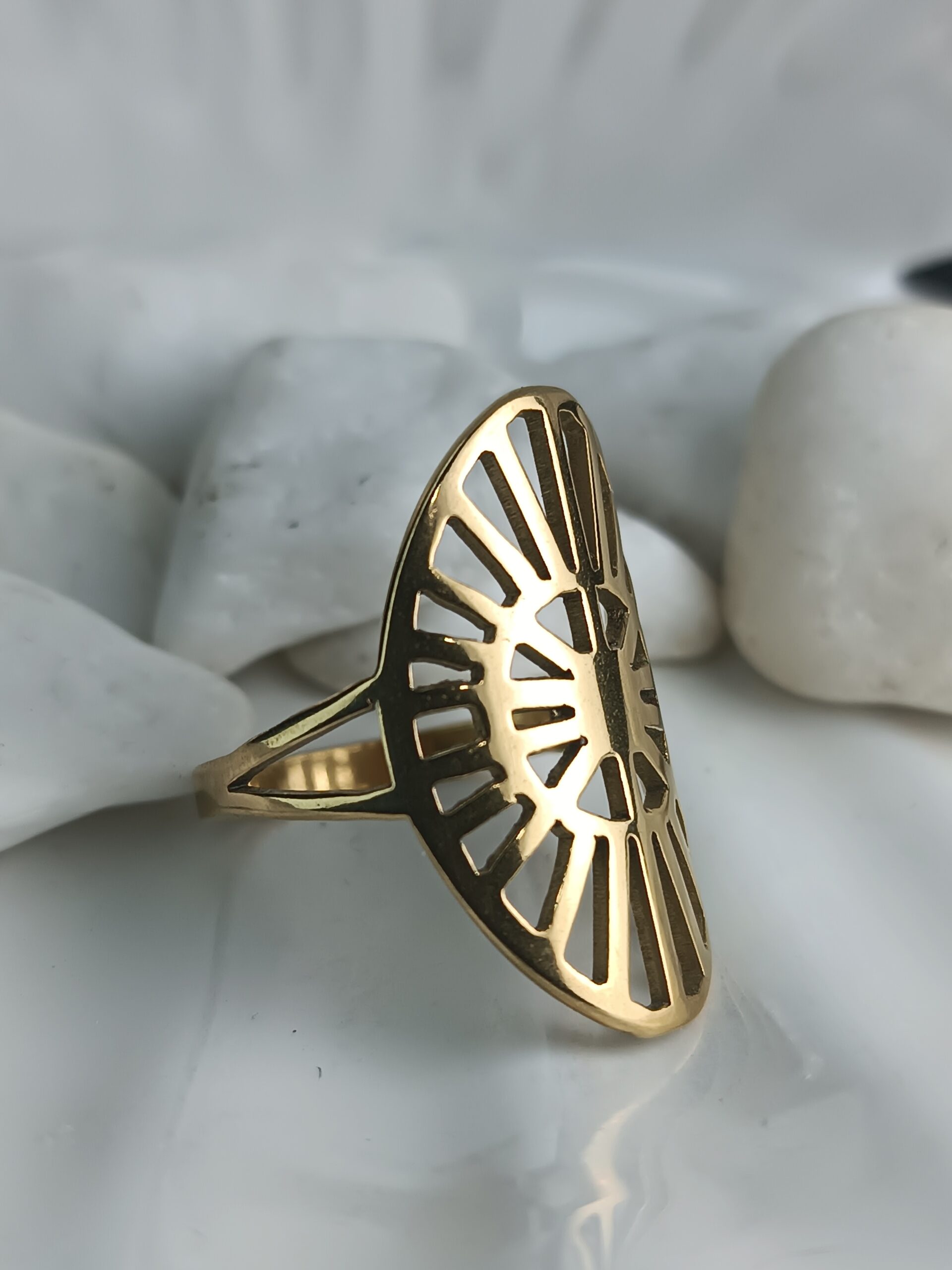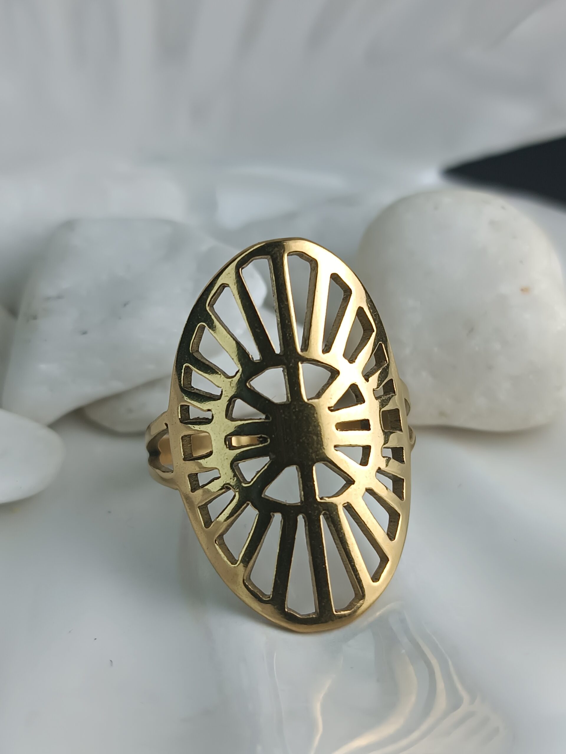Αναδείξτε το προσωπικό σας στυλ με αυτό το εντυπωσιακό δαχτυλίδι από ανοξείδωτο ατσάλι, σε χρυσό χρώμα και μοναδικό οβάλ γεωμετρικό σχέδιο. Το μεγάλο, καλλιτεχνικό του design θυμίζει ηλιακή ακτινοβολία και προσφέρει μοντέρνα κομψότητα και δυναμισμό.
