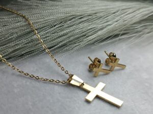 Σταυρο μαζί με σκουλαρίκια από ατσάλι σε κίτρινο χρυσο λούστρε χρώμα δεν μαυρίζουν ανθεκτικά σε νερό και απορρυπαντικά και αρώματα! Εδώ μπορείτε να το δείτε